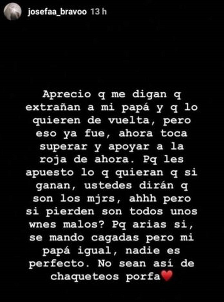 "Aprecio que me digan que extrañan a mi papá y que lo quieren de vuelta, pero eso ya fue", partió declarando la hija del histórico arquero nacional en sus historias de Instagram.