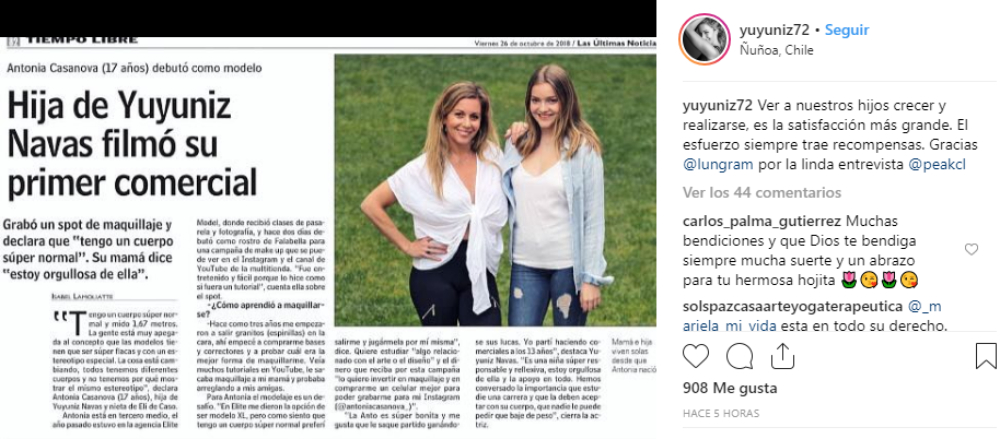 “La Anto es súper bonita y me gusta que le saque partido ganándose sus lucas. Yo partí haciendo comerciales a los 13 años (…) Es una niña súper responsable y reflexiva, estoy orgullosa de ella y la apoyo en todo. Hemos conversado la importancia que estudie una carrera y que la deben aceptar con su cuerpo, que nadie le puede pedir que baje de peso”, contó la actriz e instructora de yoga al diario nacional "LUN".