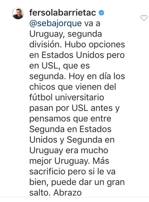 “Se va a Uruguay, segunda división. Hubo opciones en Estados Unidos, pero en USL, que es segunda. Hoy en día los chicos que vienen del fútbol universitario pasan por USL antes y pensamos que entre segunda en Estados Unidos y segunda en Uruguay era mucho mejor Uruguay”, comentó.