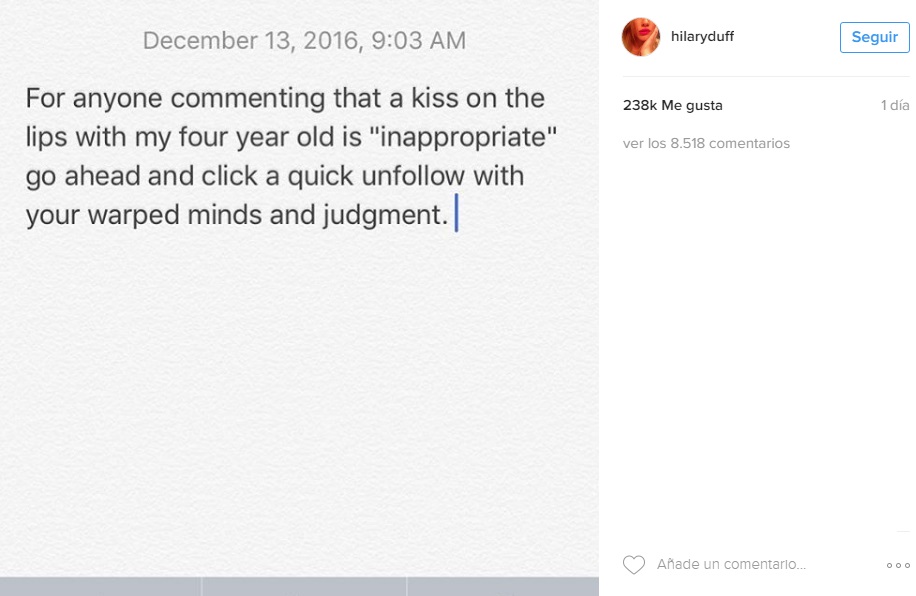 Hace unos días, Hilary Duff publicó una inocente fotografía en su cuenta de Instagram, pero jamás pensó que recibiría una ola de críticas por ella.