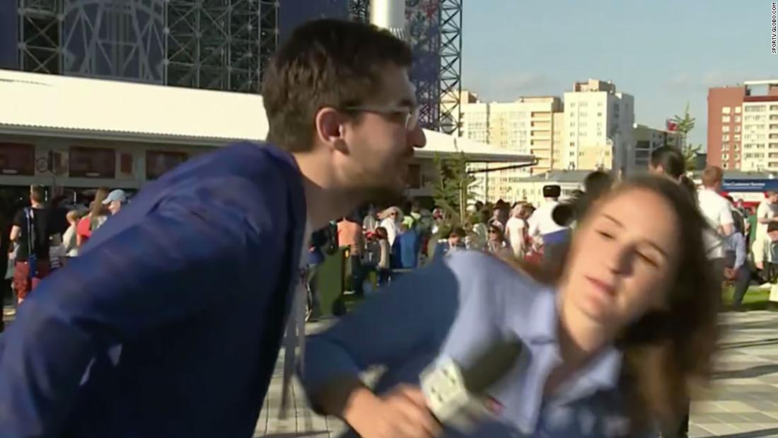 Mientras transmitía un despacho en vivo desde Rusia, la periodista Júlia Guimarães fue acosada por hincha.