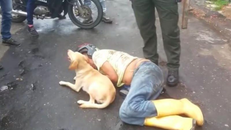 El perro cuida a su dueño, mientras él está durmiendo en la calle, luego de (al parecer) tomar excesivamente alcohol.