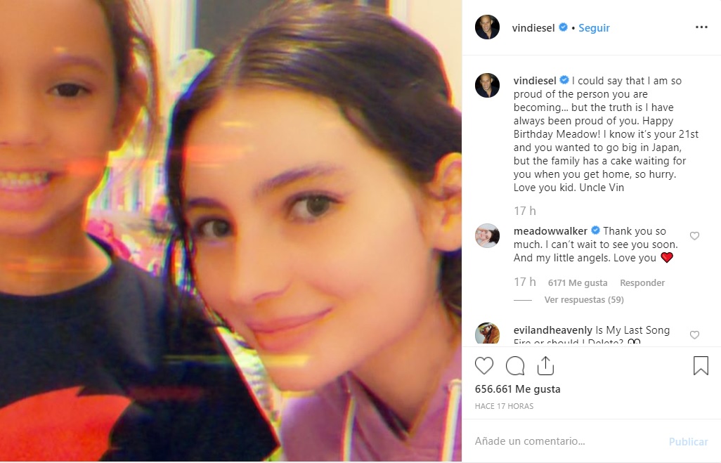 Ahora el actor volvió a recordar a Walker, esta vez a través de su hija Meadow Rain Walker, quien cumplió 21 años de edad. Diesel dedicó a la joven un tierno mensaje en Instagram donde la felicitaba.