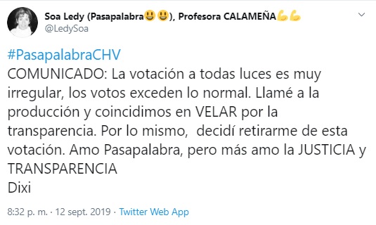 Tras la polémica que se generó, Ledy anunció en la red social que había decidido renunciar al repechaje de "Pasapalabra". "La votación a todas luces es muy irregular, los votos exceden lo normal. Llamé a la producción y coincidimos en velar por la transparencia. Por lo mismo decidí retirarme de esta votación. Amo Pasapalabra, pero más amo la justicia y transparencia", señaló.