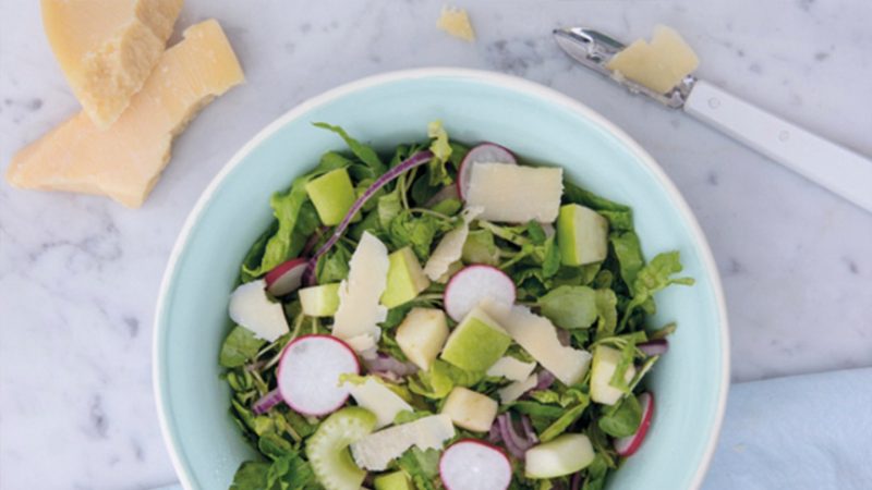 Prepare sus ingredientes: Cortar los berros; lavar, pelar y picar la manzana en cuadritos, lavar y cortar la lechuga en tiras, lavar y cortar los rábanos en rodajas; deshilar y cortar el apio en rodajas; lavar, pelar y cortar la cebolla en juliana; rallar el queso parmesano.
