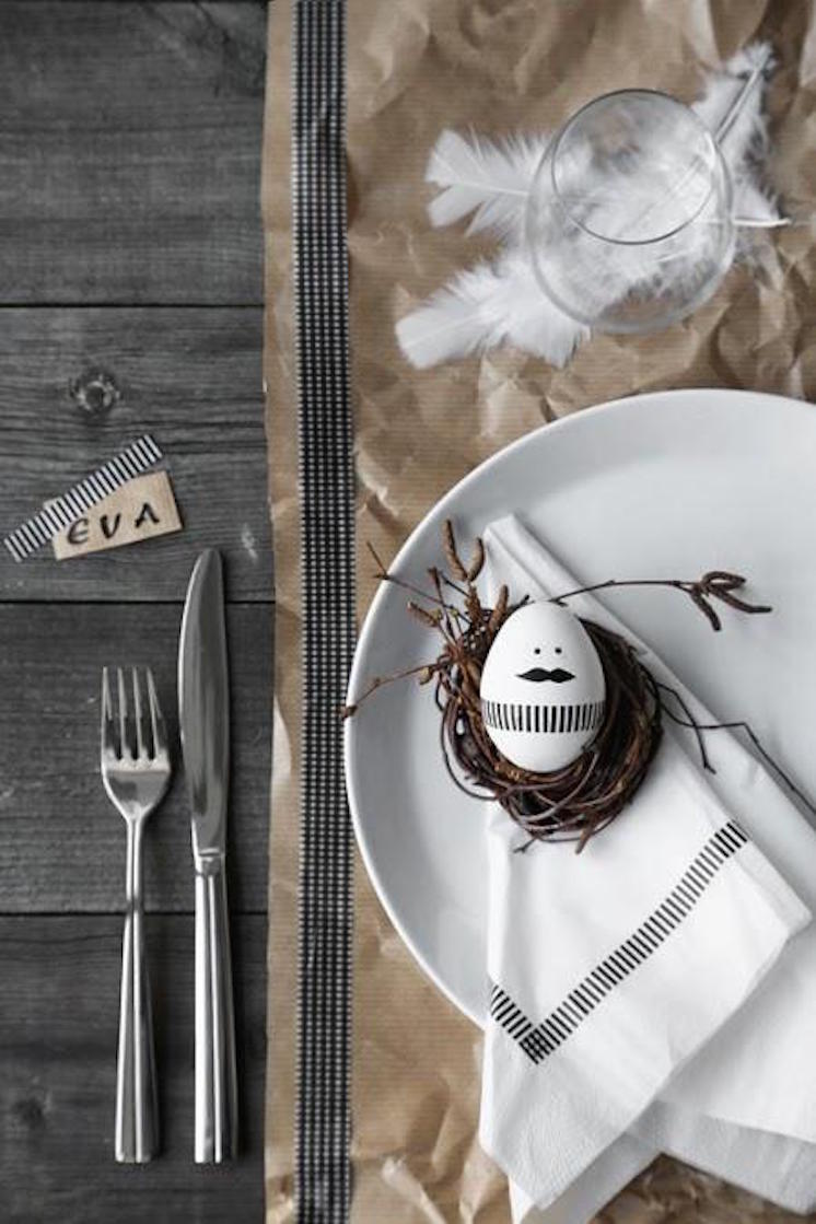 Para esta decoración necesitas solo pequeños detalles. El marcador negro será tu fiel amigo para decorar ligera pero pícaramente tus huevos de pascua. Colocarlos sobre un nido improvisado quedará muy divertido y al resto le encantará. Es una buena opción si eres alérgica a las flores, o no te agradan los colores fuertes