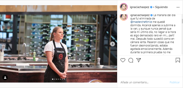 En su texto Ignacia además confesó que "al revivir ese momento me dolió el triple, porque sé que desilusioné a algunas personas y me da pena. De verdad lo siento mucho. Siempre voy a estar agradecida de haber hecho este programa, de lo aprendido tanto dentro de la cocina como fuera de ella, de la dedicación de los jueces @ferfuentescardenas @jorge.rausch @chriscarpentier y por el tiempo compartido con mis compañeros y el equipo".