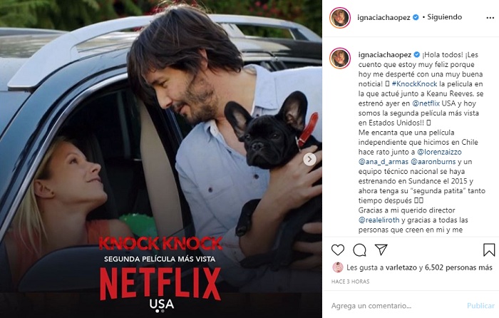 "Hola a todos. Les cuento que estoy muy feliz porque hoy me desperté con una muy buena noticia. Knock Knock, la película en la que actué junto a Keanu Reeves, se estrenó ayer en Netflix y hoy somos la segunda películas más vista en Estados Unidos", señaló.