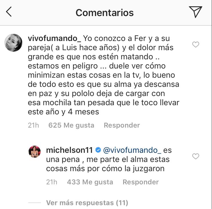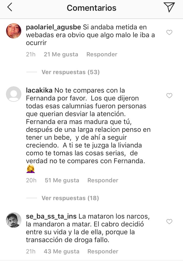 No obstante, la publicación de la chica reality no fue bien recibido por algunos de sus seguidores, quienes la criticaron por compararse con Fernanda para "justificar sus actos" o le sugirieron "informarse antes de opinar", asegurando que "el machismo no mató a nadie". Otros, en cambio, la apoyaron y agradecieron que se refiriera al caso.