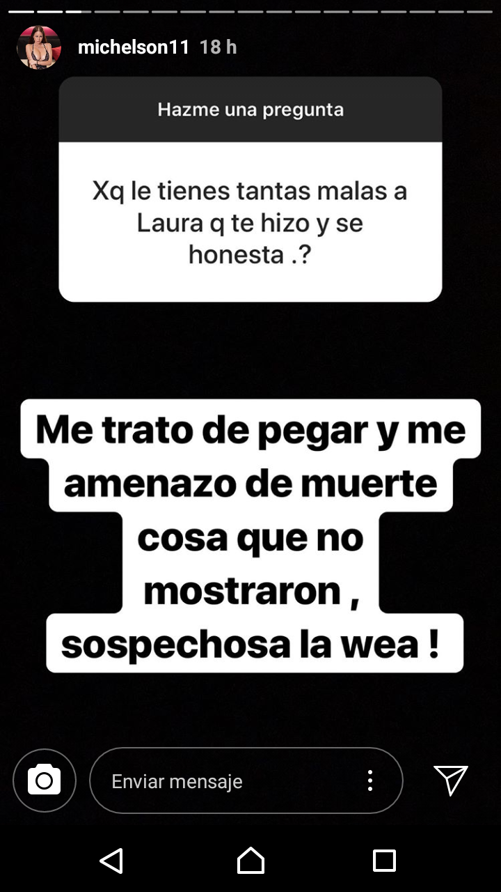 A lo que Ignacia respondió con la siguiente declaración: 'Me trato de pegar y me amenazó de muerte, cosa que no mostraron en pantalla, sopeschosa la wea!'.