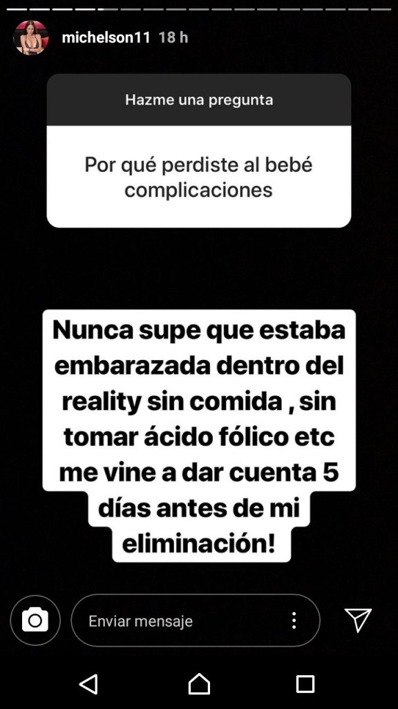 Por otra parte, Michelson contestó que en el encierro no se enteró a tiempo de que estaba embarazada, lo que probablemente influyó en la pérdida de su bebé.