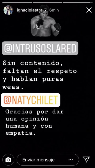 “@Intrusoslared Sin contenido. Faltan el respeto y hablan puras weas. @Natychilet gracias por dar una opinión humana y con empatía”, fue la enojada respuesta de Lastra al ver la nota, rescatando la postura de una de las panelistas, Nataly Chilet.