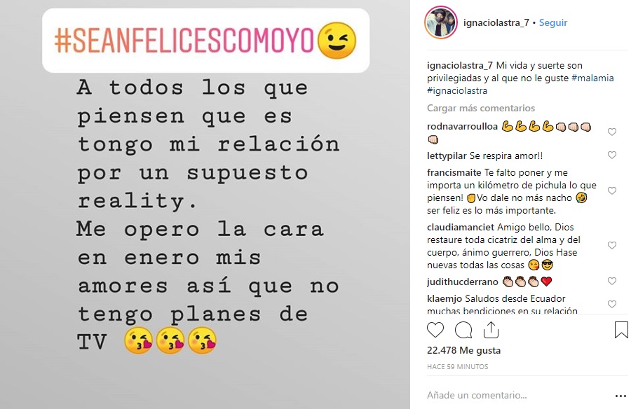 Entre las felicitaciones de algunos, otros acusaron de este romance de falso, un "tongo" para un próximo reality. Frente a esto, Ignacio no demoró en subir una publicación refiriéndose a estas acusaciones. "Mi vida y suerte son privilegiadas y al que no le guste #malamia".