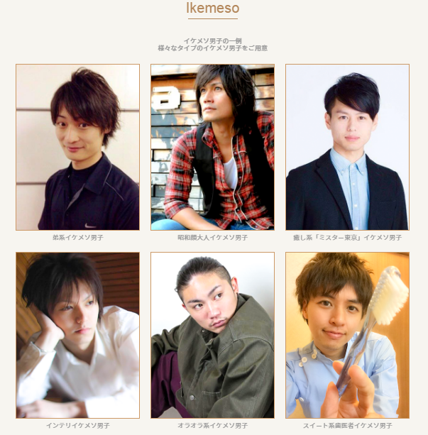 Se trata del "Ikemeso", un servicio de arriendo de hombres que hacen compañía en momentos de tristeza. La labor que cumplen ellos al ser contratados es entregarles risas y buenos momentos. Además, deben intentar que la mujer llore para que libere sus penas y posteriormente el elegido, "te tocará la mejilla con dulzura y limpiará tus lágrimas con un pañuelo de papel", según señala el creador de esta idea Hiromi Terai.