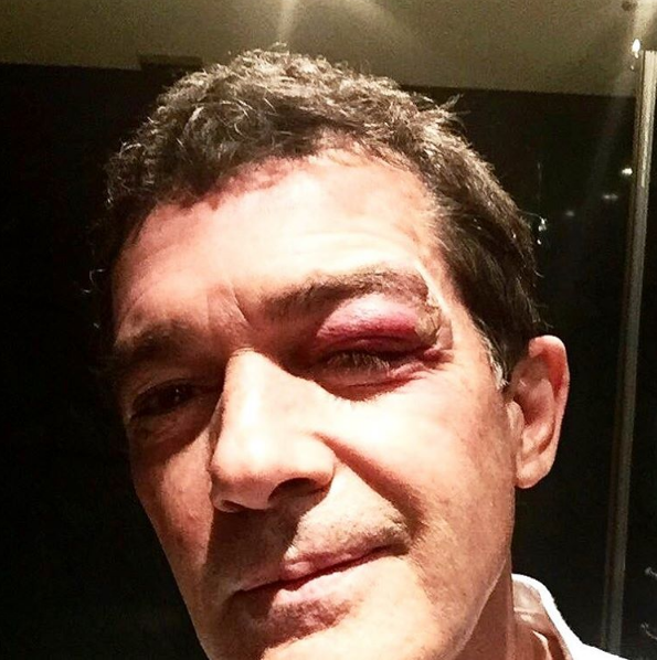 El español publicó en Instagram (@antoniobanderasoficial) una foto de su rostro en la que se aprecia un ojo hinchado y morado, luego de grabar una escena de acción.