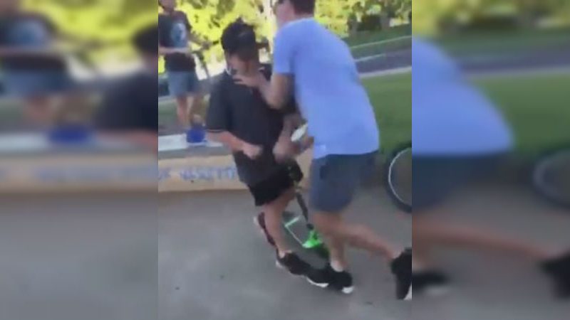 Como se aprecia en las imágenes, el adulto tomó del cuello a uno de los chicos, a otro lo lanzó a la pista de skate del parque y a un tercero casi lo golpea con una patineta en la cabeza.