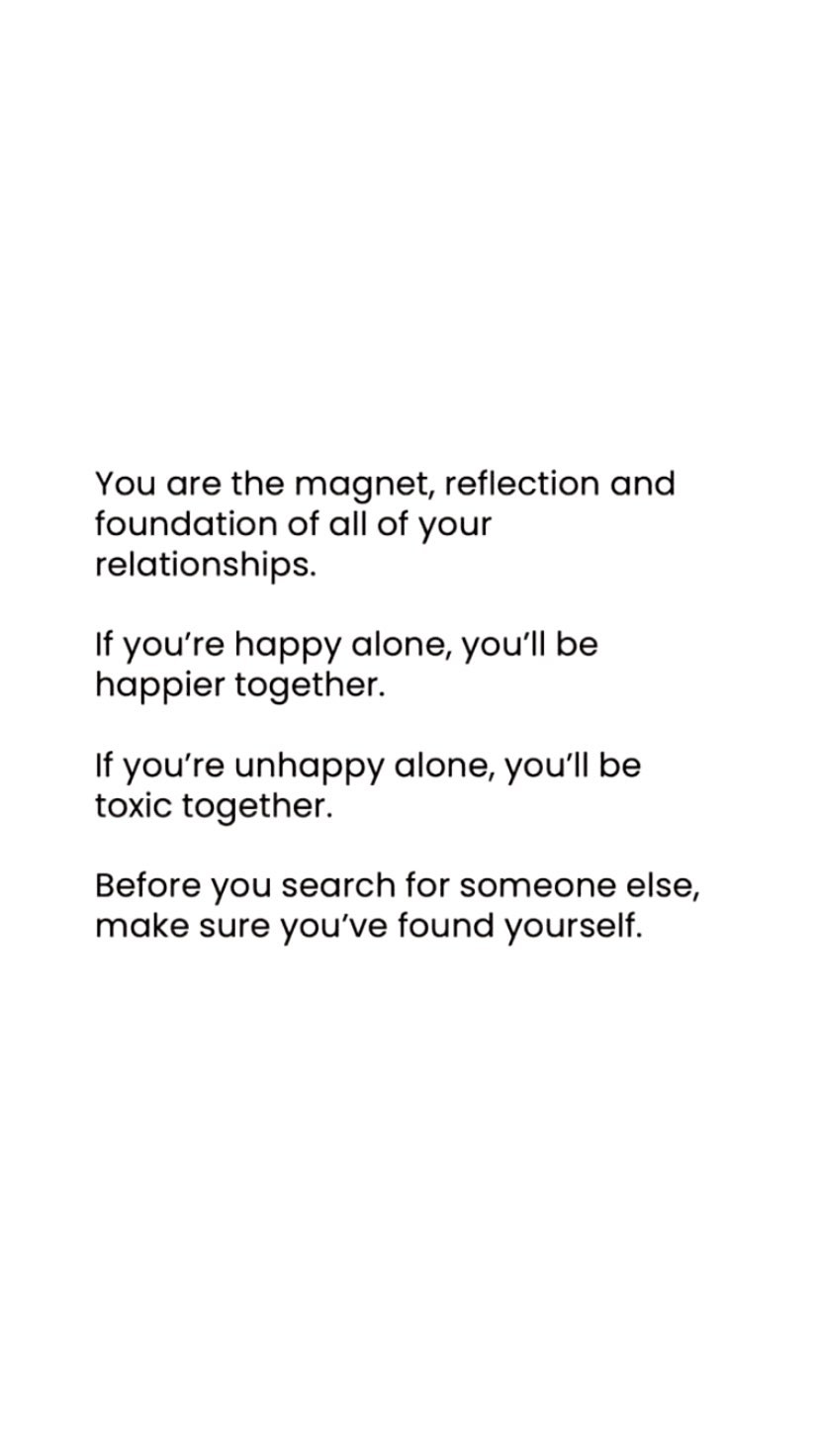 Esto dice: "Eres el imán, el reflejo y la base de todas tus relaciones. Si eres feliz solo, serán más felices juntos. Si no estás contento solo, serán tóxicos juntos. Antes de buscar a otra persona, asegúrate de haberte encontrado".
