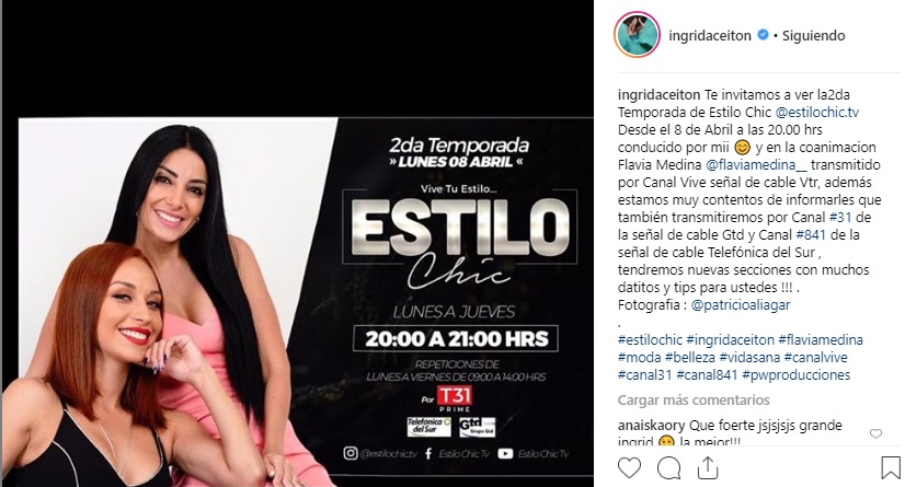 "Te invitamos a ver la2da Temporada de Estilo Chic @estilochic.tv. Desde el 8 de Abril a las 20.00 hrs conducido por mí y en la coanimacion Flavia Medina @flaviamedina__ transmitido por Canal Vive señal de cable VTR", escribió Ingrid para anunciar la noticia a través de su red social.