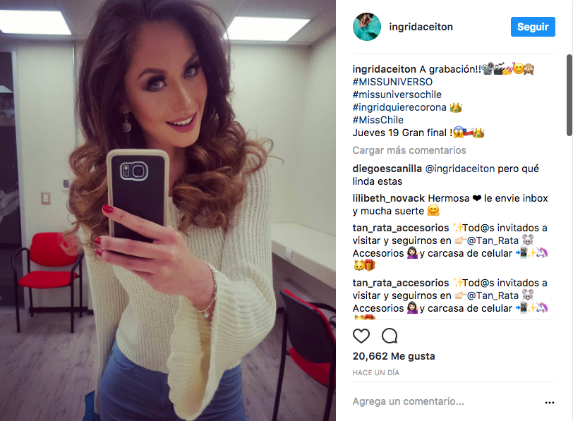 Hace un par de días la ex chica reality Ingrid Aceitón compartió a través de sus redes sociales un importante logro que la tiene muy feliz. La modelo que estuvo dentro del encierro de “Volverías con tu ex?”, publicó en su Instagram una fotografía luciendo su corona de Miss La Florida, y en ella agradeció el apoyo de sus seguidores además de revelar que participará para representar a Chile en el próximo Miss Universo.