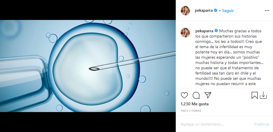 "Somos muchas las mujeres esperando un “positivo” muchas historia y todas importantes... no puede ser que el tratamiento de fertilidad sea tan caro en Chile y el mundo!!!! No puede ser que muchas mujeres no puedan recurrir a este tratamiento solo por no tener los medios!!", enfatizó.