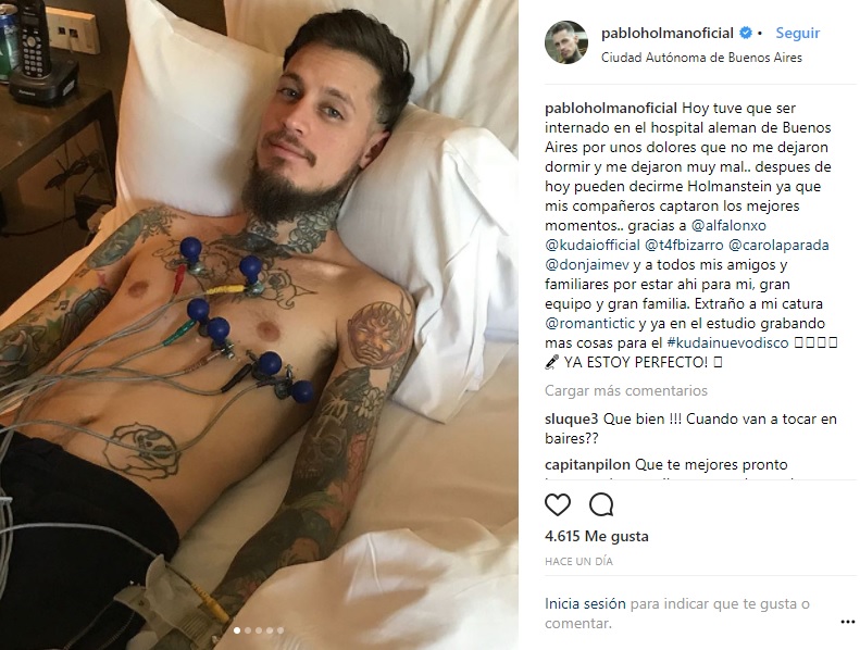 "Hoy tuve que ser internado en el Hospital Alemán de Buenos Aires por unos dolores que no me dejaron dormir y me dejaron muy mal", parte diciendo una publicación a través de su cuenta de Instagram, el cantante Pablo Holman, uno de los integrantes de la banda juvenil Kudai.