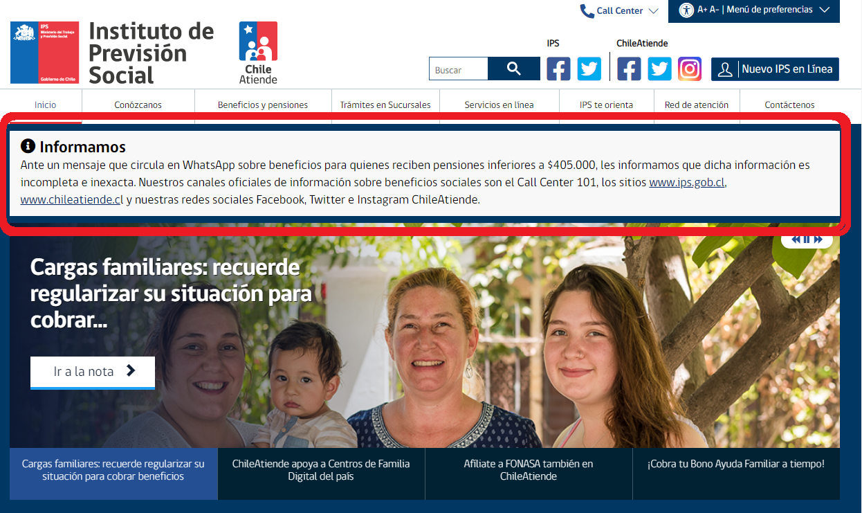 Frente a esto, el Instituto de Previsión Social (IPS) publicó a través de su página web un aviso en que desmienten el mensaje, indicando que “dicha información es incompleta e inexacta“.