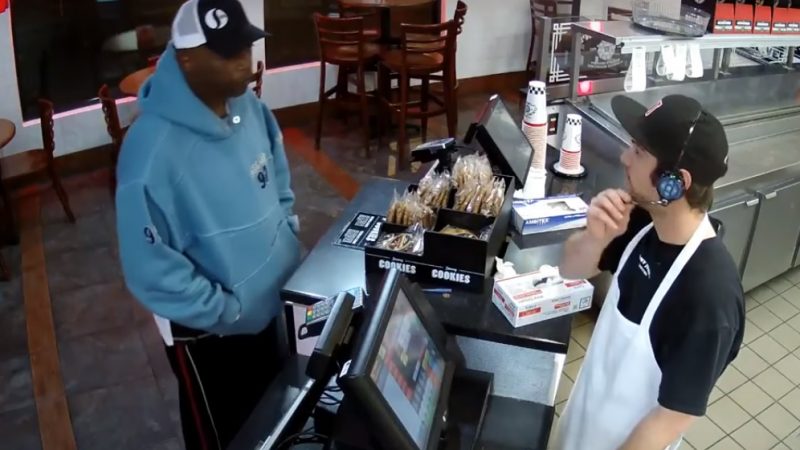 Uno de los riesgos más grandes al momento de trabajar prestando servicios a clientes es el de ser asaltado. Ese fue el caso de este joven cajero de un local de comida rápida en Estados Unidos que, como se muestra en las imágenes, se hizo famoso por la particular reacción que tuvo frente a un asalto.