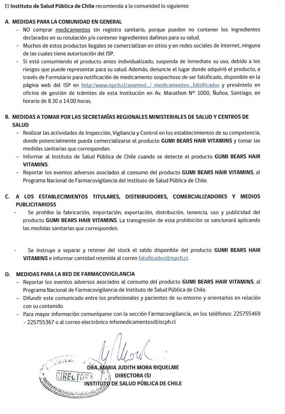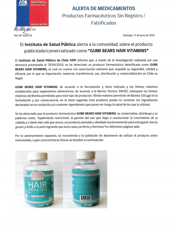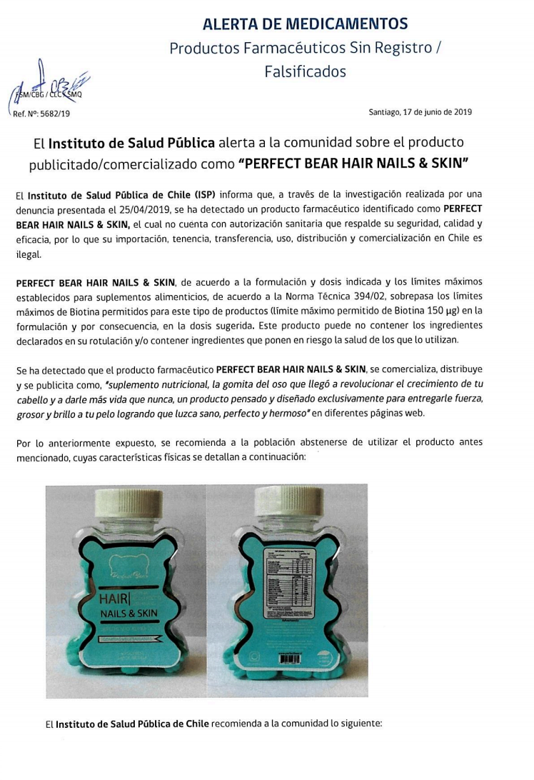 Varias alertas fueron emitidas por el Instituto de Salud Pública (ISP) esta semana, por productos que son comercializados como vitaminas para el pelo y las uñas llamados "Gumi Bears Hair Vitamins" y Perfect Bear Hair Nails & Skin".