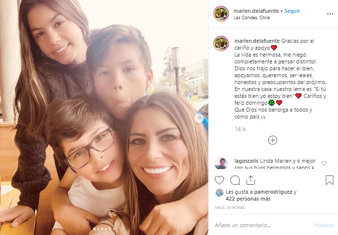 'Gracias por el cariño y apoyo. La vida es hermosa, me niego completamente a pensar distinto! Dios nos trajo para hacer el bien, apoyarnos, querernos, ser leales, honestos y preocuparnos del prójimo. En nuestra casa nuestro lema es “Si tú estás bien yo estoy bien”. Cariños y feliz domingo. Que Dios nos bendiga a todos y como país', escribió De La Fuente en su red social este domingo.