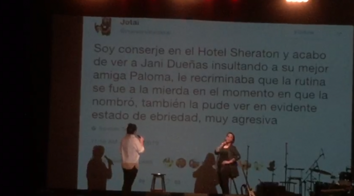 “Soy conserje en el Hotel Sheraton y acabo de ver a Jani Dueñas insultando a su mejor amiga Paloma (Salas). Le recriminaba que la rutina se fue a la mierda en el momento en que la nombró. También la pude ver en evidente estado de ebriedad, muy agresiva”, escribió el usuario @nuevonuevojotai.