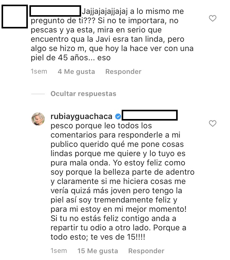 Debido a los haters, Acevedo se molestó y decidió responderle a una de ellas. "Pesco porque leo todos los comentarios para responderle a mi publico querido que me pone cosas lindas porque me quiere y lo tuyo es pura mala onda. Yo estoy feliz como soy porque la belleza parte de adentro y claramente si me hiciera cosas me vería quizá más joven pero tengo la piel así soy tremendamente feliz y para mi estoy en mi mejor momento! Si tu no estás feliz contigo anda a repartir tu odio a otro lado. Porque a todo esto; te ves de 15!!!!", expresó.