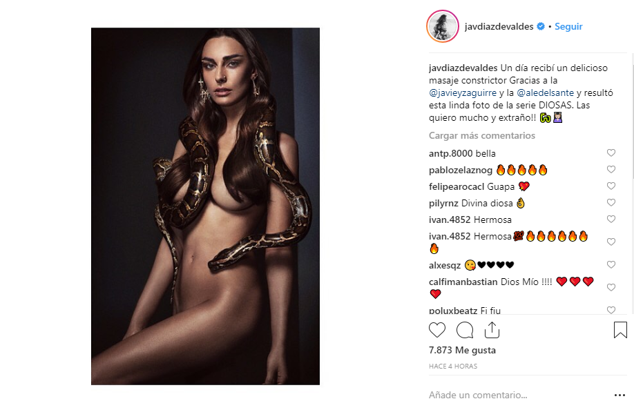La imagen pertenece a una sesión fotográfica realizada por Javiera Eyzaguirre y en donde la actriz aparece con una serpiente rodeando su cuerpo.