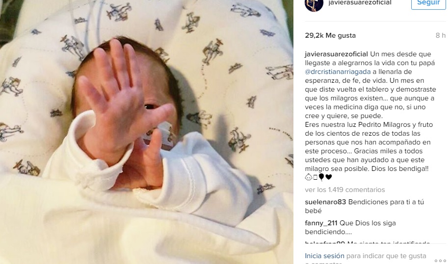 A través de su cuenta de Instagram, la animadora publicó una foto de su bebé junto a un mensaje que decía: "Un mes en que diste vuelta el tablero y demostraste que los milagros existen... que aunque a veces la medicina diga que no, si uno cree y quiere, se puede. Eres nuestra luz Pedrito Milagros y fruto de los cientos de rezos de todas las personas que nos han acompañado en este proceso... Gracias miles a todos ustedes que han ayudado a que este milagro sea posible. Dios los bendiga!!"