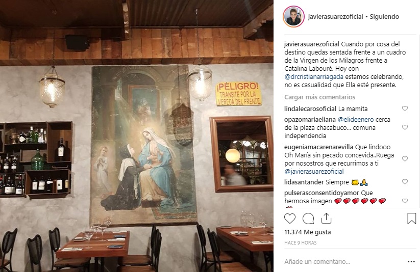 "Cuando por cosa del destino quedas sentada frente a un cuadro de la Virgen de los Milagros frente a Catalina Labouré. Hoy con @drcristianarriagada estamos celebrando, no es casualidad que Ella esté presente", agregó Suárez.