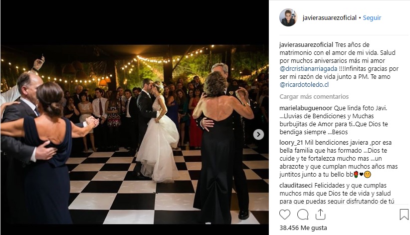 "Tres años de matrimonio con el amor de mi vida. Salud por muchos aniversarios más mi amor @drcristianarriagada!!! Infinitas gracias por ser mi razón de vida junto a PM. Te amo", escribió Javiera junto a una foto de su matrimonio.