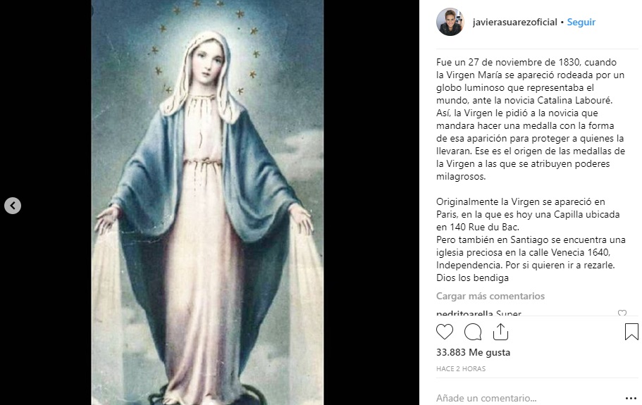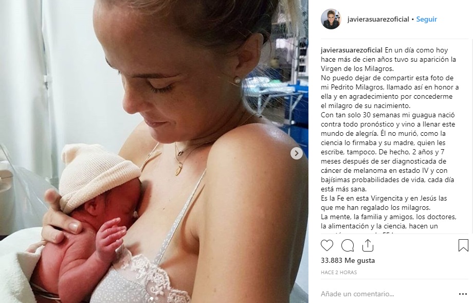 La foto fue publicada por la autora del libro "Liveat" conmemorando los cien años de la aparición de la Virgen de los Milagros, a quien Javiera le atribuye gran parte de su recuperación y la posibilidad de tener a Pedrito, que nació contra todo pronóstico a las 30 semanas de gestación. Recordemos que la periodista estaba embarazada mientras se entera de que padecía de un agresivo cáncer de melanoma.