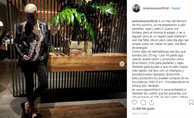 Y esta vez publicó en su Instagram una buena noticia: “A un mes del término de mis quimios, ya me empezaron a salir pestañas, ¡¡cejas y pelo!! Suena una tontera, pero el mirarse al espejo y ver a alguien sano ¡¡es un regalo cada mañana!! Aún me falta, obvio, pero cada día algo tan simple como ver crecer mi pelo, ¡me llena de energía!”, partió diciendo en la publicación.