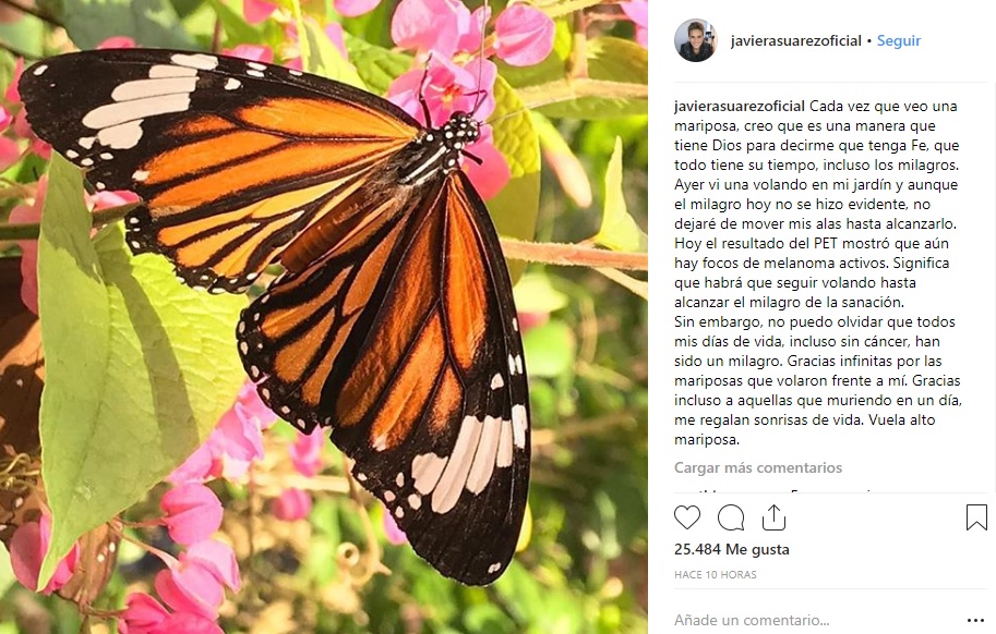En una nueva publicación que realizó en Instagram con la foto de una mariposa, Javiera mando un emotivo mensaje. “Cada vez que veo una mariposa, creo que es una manera que tiene Dios para decirme que tenga Fe, que todo tiene su tiempo, incluso los milagros. Ayer vi una volando en mi jardín y aunque el milagro hoy no se hizo evidente, no dejaré de mover mis alas hasta alcanzarlo.Hoy el resultado del PET mostró que aún hay focos de melanoma activos. Significa que habrá que seguir volando hasta alcanzar el milagro de la sanación”, reveló.