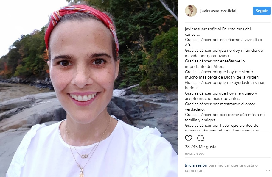 "En este mes del cáncer... Gracias cáncer por enseñarme a vivir día a día. Gracias cáncer porque no doy ni un día de mi vida por garantizado. Gracias cáncer por enseñarme lo importante del Ahora. Gracias cáncer porque hoy me siento mucho más cerca de Dios y de la Virgen. Gracias cáncer porque me ayudaste a sanar heridas. Gracias cáncer porque hoy me quiero y acepto mucho más que antes. Gracias cáncer por mostrarme el amor verdadero. Gracias cáncer por acercarme aún más a mi familia y amigos. Gracias cáncer por hacer que cientos de personas diariamente me llenen con sus oraciones y lindas palabras. Gracias cáncer porque, aunque preferiría no tenerte, día a día me enseñas algo bueno. Gracias cáncer por sacar mi mejor versión", escribió Javiera en su Instagram.