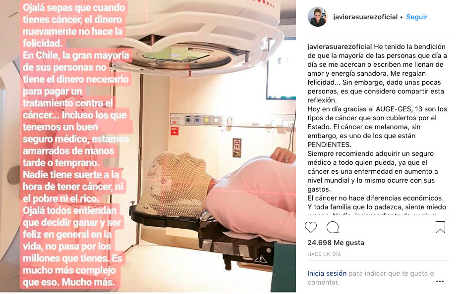 Por esa misma razón, decidió publicar una importante reflexión sobre el dinero y la felicidad. "Sin embargo, dado unas pocas personas, es que considero compartir esta reflexión. Hoy en día gracias al AUGE-GES, 13 son los tipos de cáncer que son cubiertos por el Estado. El cáncer de melanoma, sin embargo, es uno de los que están PENDIENTES", continúa con su mensaje.