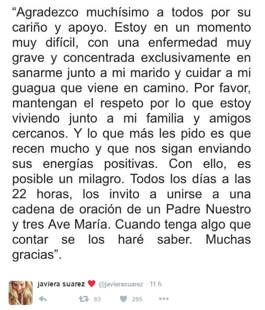Pero hasta ayer, la también animadora de Zona Latina no había querido referirse al tema. Finalmente utilizó su cuenta de Twitter para hablar: "Agradezco muchísimo a todos por su cariño y apoyo. Estoy en un momento muy difícil, con una enfermedad muy grave y concentrada exclusivamente en sanarme junto a mi marido y cuidar a mi guagua que viene en camino. Por favor, mantengan el respeto por lo que estoy viviendo junto a mi familia y amigos cercanos. Y lo que más les pido es que recen mucho y que nos sigan enviando sus energías positivas. Con ello, es posible un milagro. Todos los días a las 22 horas, los invito a unirse a una cadena de oración de un Padre Nuestro y tres Ave María. Cuando tenga algo que contar se los haré saber. Muchas gracias".
