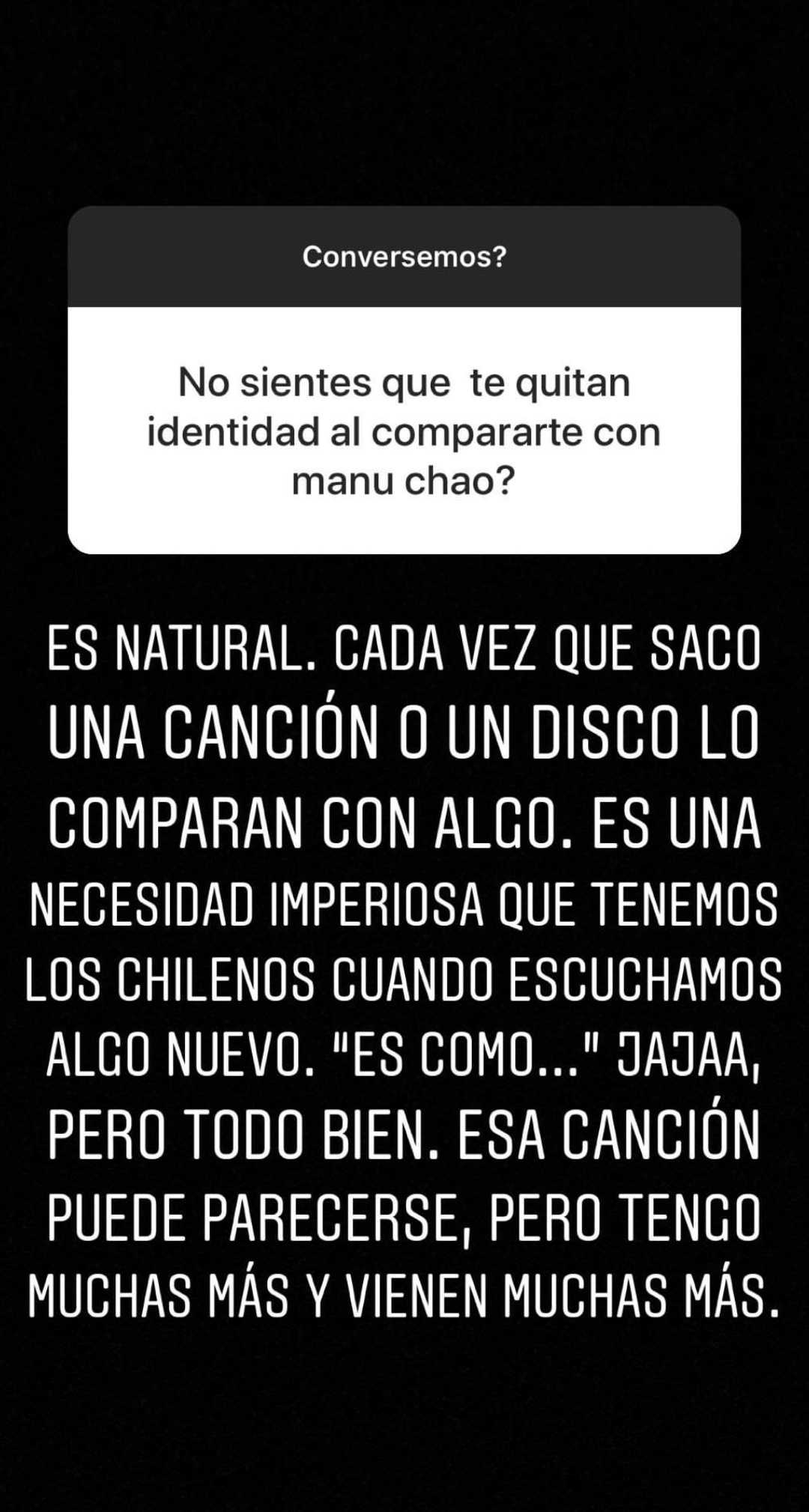 En este contexto, el animador de "La noche es nuestra" decidió hacer un tiempo de preguntas en sus historias de Instagram, donde un usuario le preguntó sobre ello. “¿No sientes que te quitan ientidad al compararte con Manu Chao?”, fue la pregunta, a lo que Jean Philippe respondió: “Cada vez que saco una canción o un disco lo comparan con algo. Es una necesidad imperiosa que tenemos los chilenos cuando escuchamos algo nuevo”.