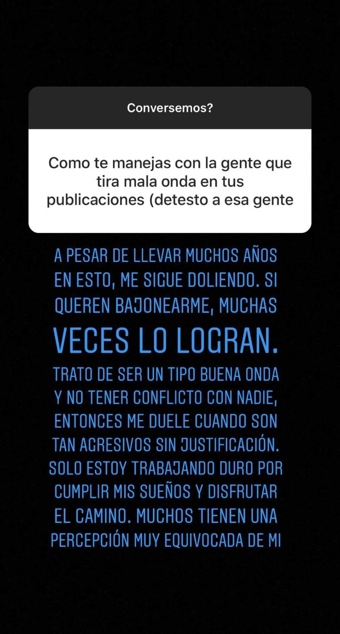 Pero luego le preguntaron qué opinaba sobre los comentarios negativos que recibe a diario en sus redes, a lo que se mostró bien sensible. “A pesar de llevar muchos años en esto, me sigue doliendo”, escribió, agregando que: “Me duele cuando son tan agresivos sin justificación”.