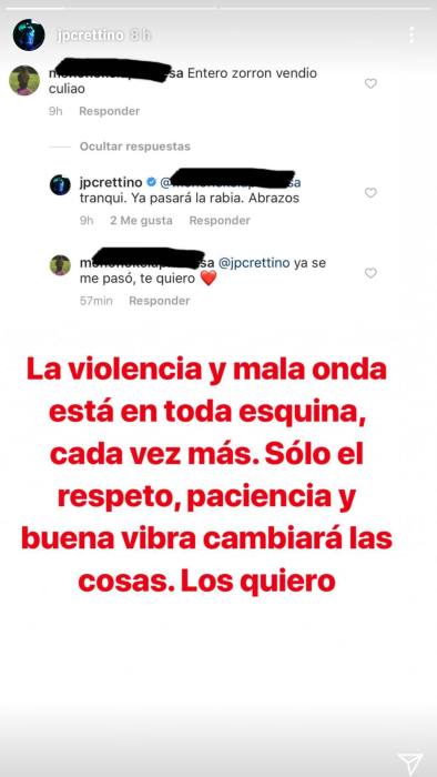 "Entero zorrón vendio", fue lo que le escribió un usuario y que el animador exhibió con un pantallazo, ocultando su identidad. Además en la imagen se puede ver la tranquila y bien intencionada respuesta de Cretton. “Tranquilo. Ya pasará la rabia. Abrazo”.