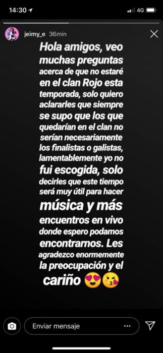Si bien salió segundo lugar en la categoría de cantantes, Jeimy Esponiza no será parte de "El clan Rojo", según ella misma lo anticipó a través de un mensaje en su Instagram Stories.