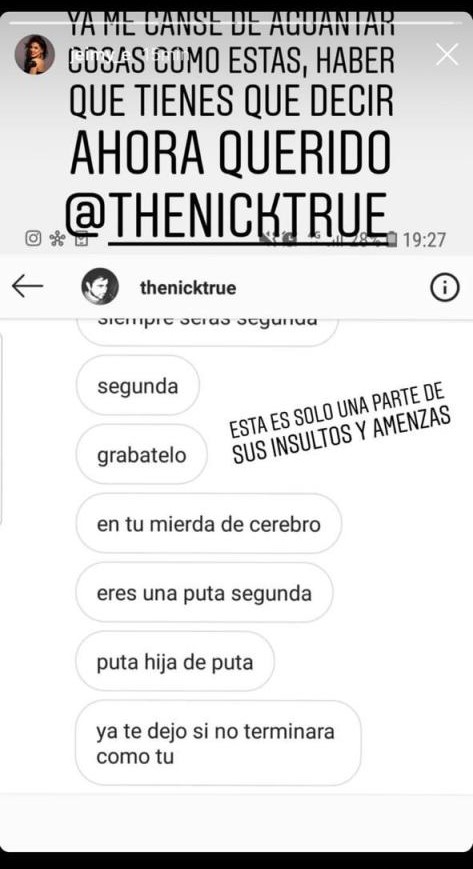 “Ya me cansé de aguantar cosas como éstas. A ver, ¿qué tienes que decir ahora querido @TheNickTrue?”, escribió la cantante para acompañar un pantallazo en el que se leen los insultos.
