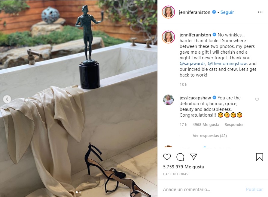 Luego agregó: "en algún lugar entre estas dos fotos, mis compañeros me dieron un regalo que apreciaré y una noche que nunca olvidaré". En la otra imagen se podía ver precisamente cómo Jennifer celebró su logro. Se dio un relajante baño de tina dejando su vestido y sandalias a un lado.
