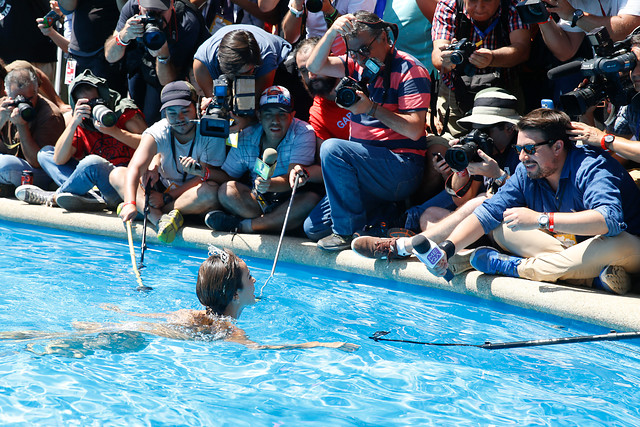 "Es el momento en el que he estado más nerviosa en mi vida. Vas caminando y son 700 periodistas" parte diciendo la modelo, quien para su recordado piscinazo usó sobre su cuerpo sólo pequeños cristales. "Yo me hacía la que la estaba pasando bien, pero por dentro estaba súper nerviosa”, reveló en una entrevista con Glamorama.cl