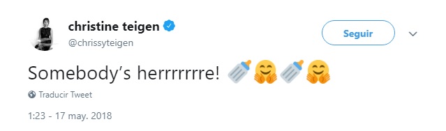 La noticia la confirmó la propia Chrissy a través de su cuenta de Twitter. "¡Alguien está aquí!", escribió la modelo acompañando su twit por emoticones de caritas felices y mamaderas. Publicación que al instante fue retuiteada por su marido.