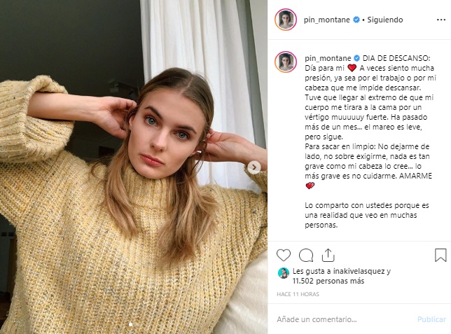 'Día de descanso: Día para mí. A veces siento mucha presión, ya sea por el trabajo o por mi cabeza que me impide descansar. Tuve que llegar al extremo de que mi cuerpo me tirara a la cama por un vértigo muuuuuy fuerte. Ha pasado más de un mes... el mareo es leve, pero sigue', comenzó contando la actriz.